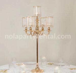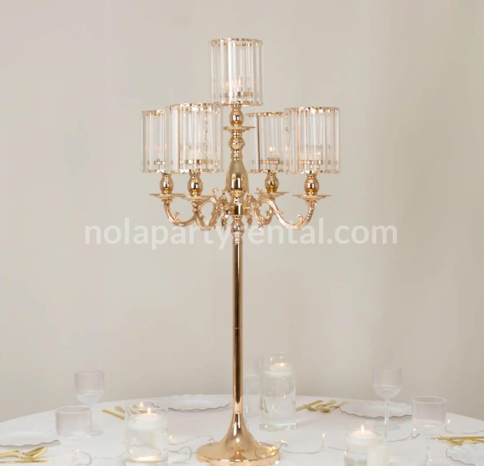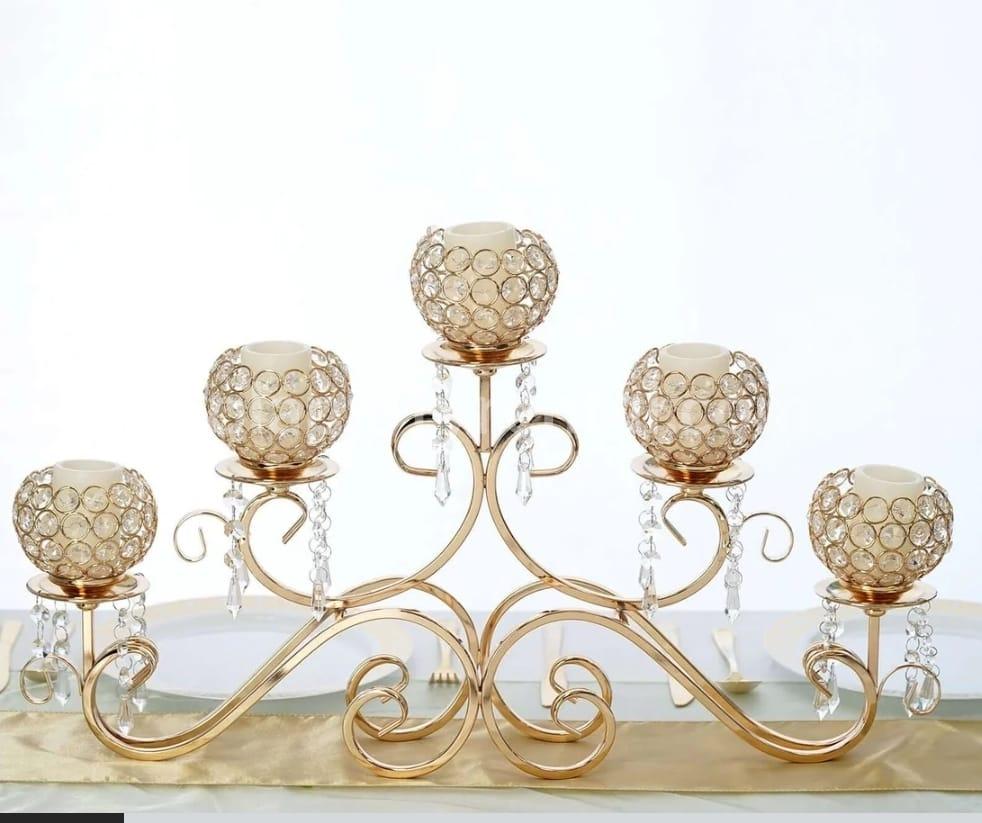 5-Arm Gold Metal Candelabra with Crystal Pendant Glass Shades