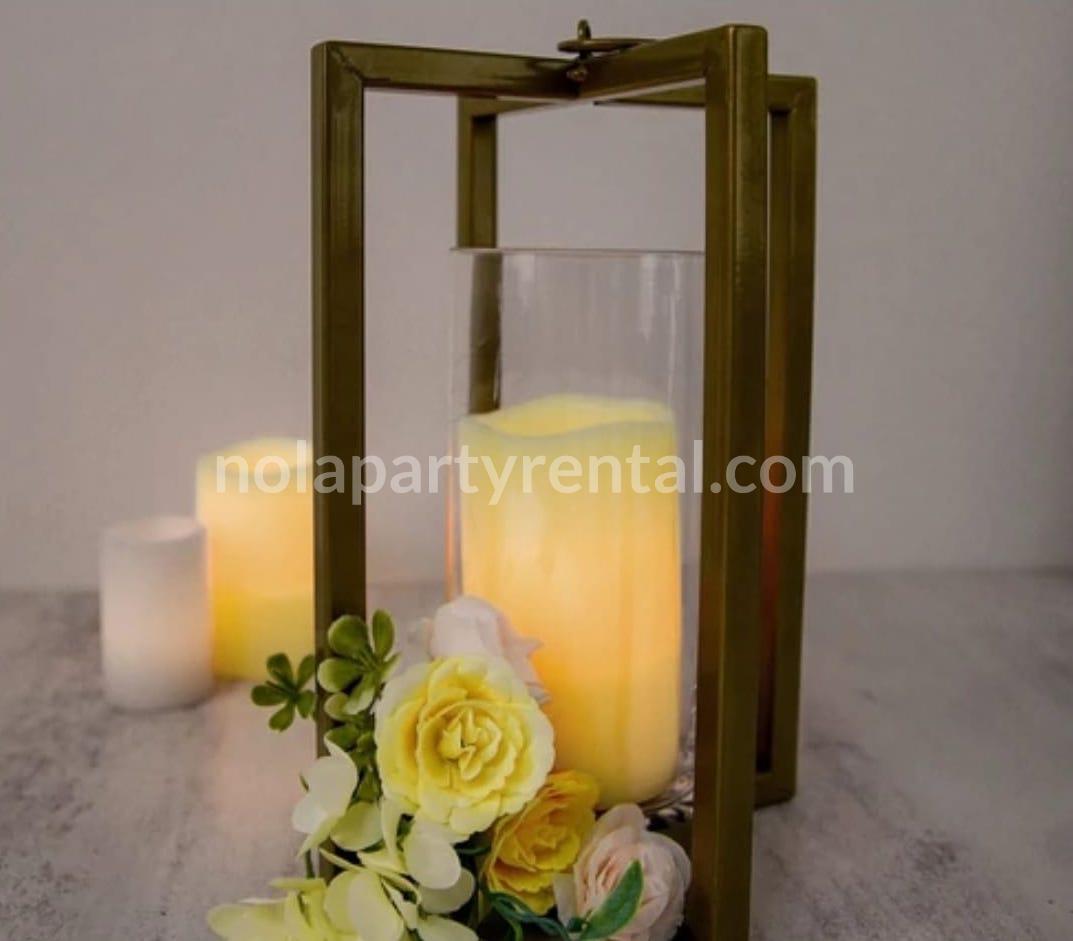 11″ Gold Metal Cross Bar Decorative Lantern Candle Holder, Iron Geometric Centerpiece
